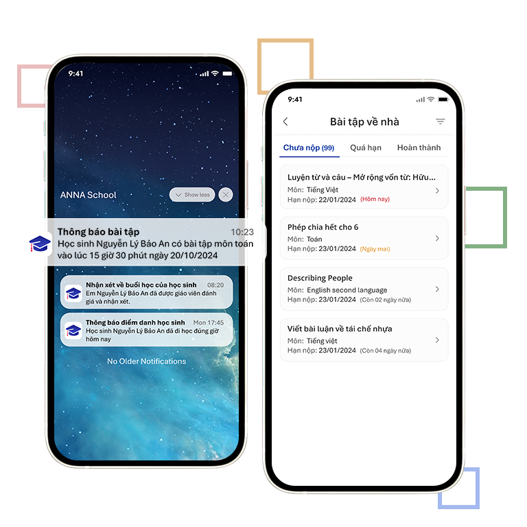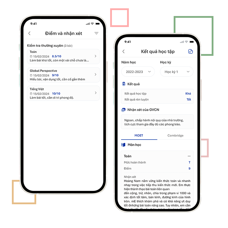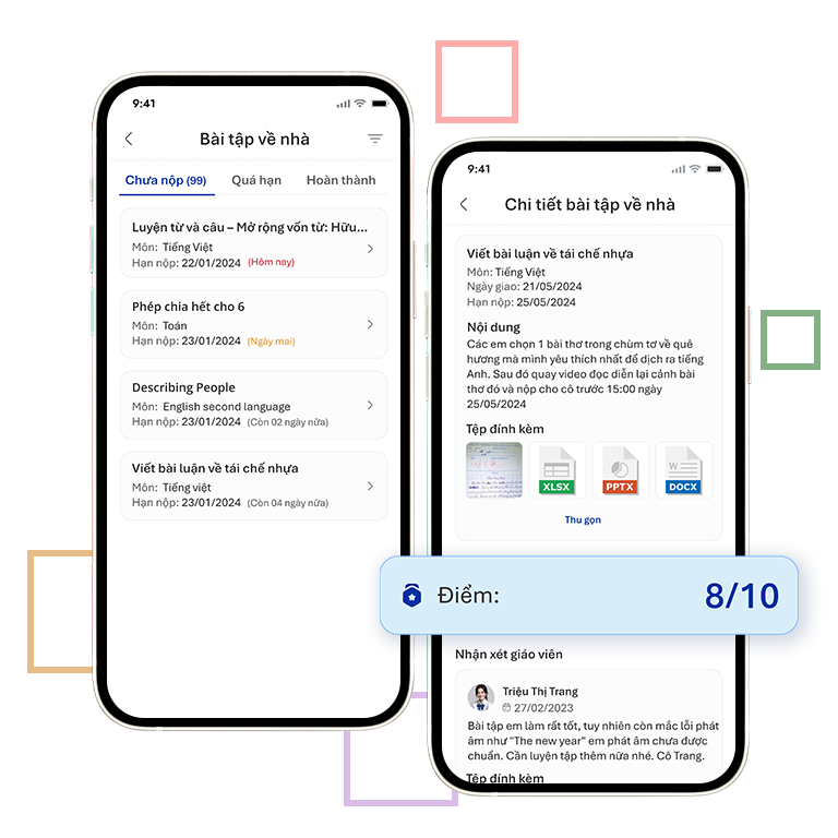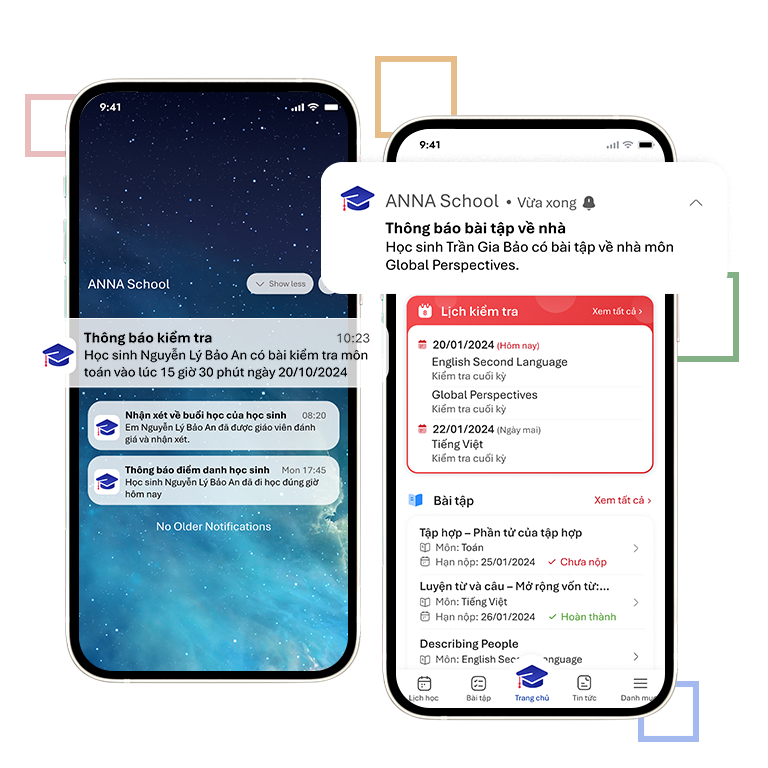 Học sinh có thể theo dõi thời khóa biểu, lịch kiểm tra, điểm số và nộp bài trực tuyến mọi lúc.