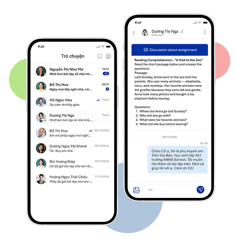 - Phụ huynh chat trực tiếp với giáo viên để trao đổi về tình hình học tập, nề nếp và các vấn đề cần phối hợp. Ứng dụng cung cấp danh bạ giáo viên đầy đủ theo từng lớp/môn để phụ huynh liên hệ dễ dàng.