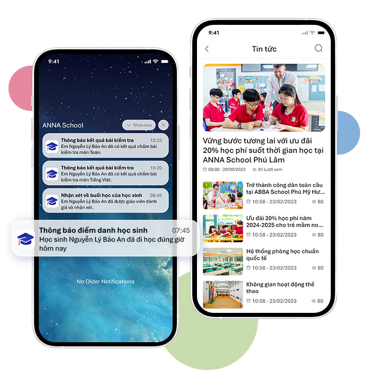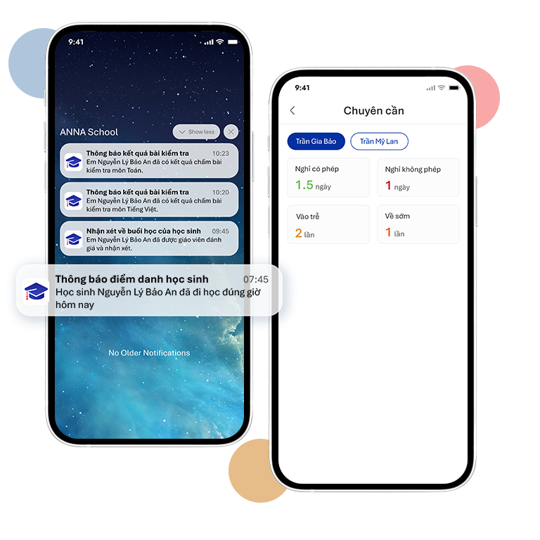 Phụ huynh có thể theo dõi kết quả học tập, điểm danh và các thông tin quan trọng của con mọi lúc.
