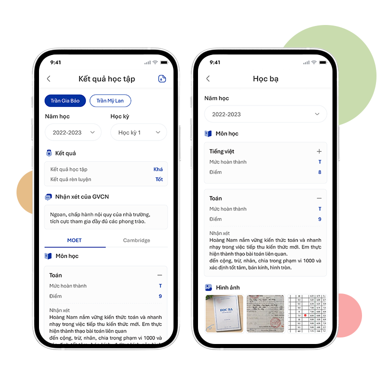 - Phụ huynh xem điểm số, nhận xét, bài tập, lịch kiểm tra và báo cáo tiến độ học tập. Nhờ đó dễ dàng nhận biết con đang tiến bộ ra sao và cần hỗ trợ ở những môn nào.