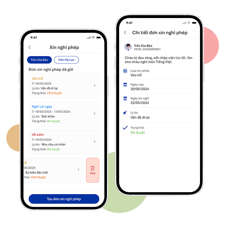 - Phụ huynh gửi yêu cầu nghỉ học cho con ngay trong ứng dụng. Giáo viên tiếp nhận – phê duyệt và hệ thống tự động cập nhật vào bảng chuyên cần.